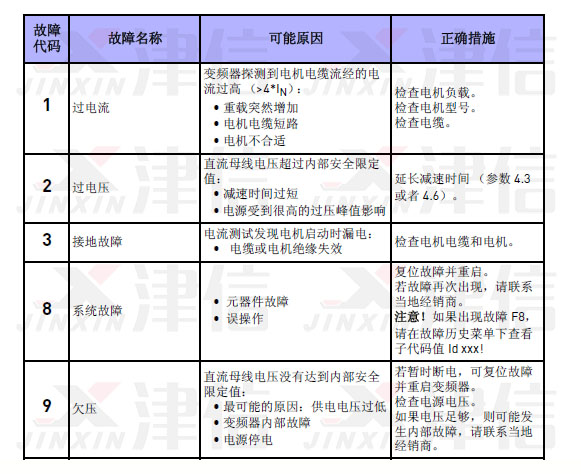 偉肯變頻器的故障和時間記錄存儲在故障歷史子菜單內(nèi),用戶可以瀏覽該菜單。下表列出了不同的故障代碼及其發(fā)生原因和更正措施。