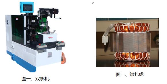 雙綁機用于綁扎電機定子線圈,主要動作有定子鐵芯分度,針桿進退、上下和角度控制,自動剪切線等,設有綁線張力調節器,可調節綁線的松緊。整機如圖一所示,綁扎效果如圖二。