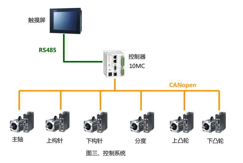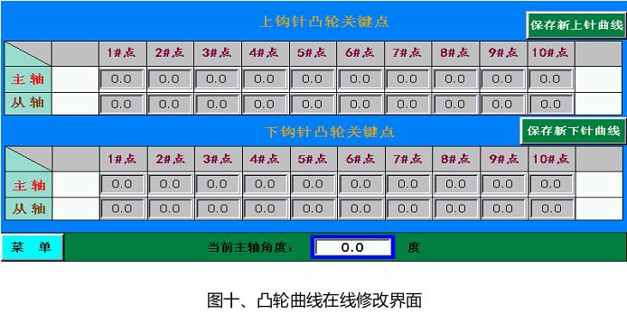 10MC總線運動控制器控制主軸運行,主軸帶動機械凸輪控制鉤針的前后運動,同時主軸又作為鉤針、上下電子凸輪的主軸信號,控制鉤針伺服、上下凸輪伺服根據預設的凸輪數據運動。