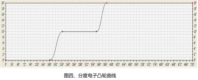 設備通過分度伺服跟隨主軸執行預先設定的電子凸輪數據,從而達到對定子的分度控制。分度電子凸輪曲線如圖四所示。