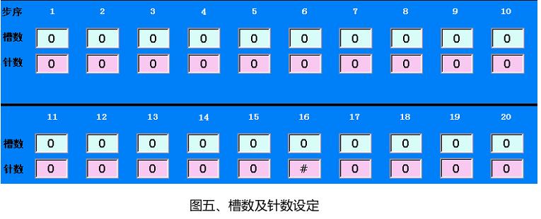用戶可以通過HMI一鍵生成“逐槽綁”數據,也可以自行設定綁扎槽位順序,自定義每一槽針數,還可以設定定子分度方向,從而實現逐槽綁、花式綁、正綁、反綁。設定界面如圖五所示。
