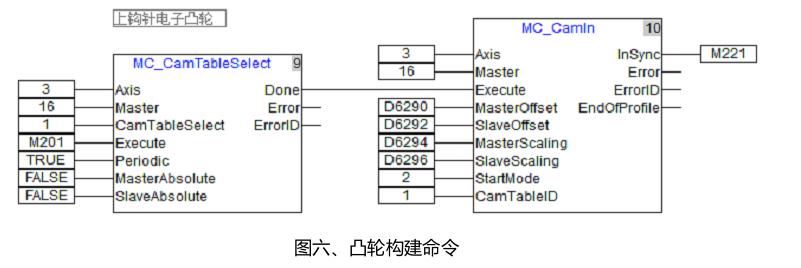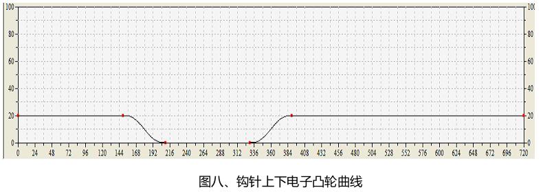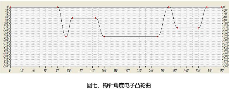 首先構建好凸輪曲線,使用“MC_CamTableSelect”指令選擇對應的凸輪曲線;再通過“MC_Camin”指令使得主軸與從軸按照選定的凸輪曲線嚙合(如圖六所示)。構建完成的鉤針角度電子凸輪曲線如圖七所示,構建完成的鉤針上下電子凸輪曲線如圖八所示,