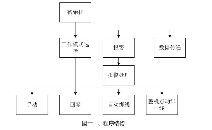 初始化程序負責在控制器送電開機后,對運動控制器的通訊端口、I/0端口以及程序進行初始化操作;然后起動后臺報警程序,用于監控機器的故障狀態,當設備發故障后,根據故障的等級,令設備執行急停、暫停、警告等相對應的處理;然后進入回零模式,找到各軸的零位,并令各軸進入工作起始位置;只有等回零模式完成以后,設備才能進入自動工作模式;最后程序根據客戶選擇的工作模式,在得到起動命令以后,正式開始運行。一臺定子綁扎完畢以后,定子被自動送出,這時程序回到前面狀態,等待新的起點命令。如此周而復始。