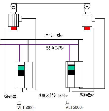 變頻器由共用直流母線供電, 丹佛斯可提供整流/回饋裝置或由用戶提供. 各分部速度可由現(xiàn)場總線提供, 也可由變頻器本身形成速度鏈. 變頻器采用速度閉環(huán)控制. 從變頻器的速度參考值由主變頻器給定. 同時主變頻器提供給從變頻器轉矩信號. 從變頻器根據其轉矩與主變頻器的差別, 動態(tài)修正從變頻器的轉速, 從而保證兩個變頻器出力一致. 所有運算通過可自由編程的工藝控制卡實現(xiàn).