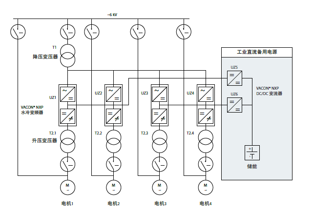 通過采用低壓水冷變頻器并結合“降壓-升壓”方案,來驅動中壓電機,IC-ART 和丹佛斯共同開發的直流備用電源系統來保證主電晃電或故障時的可靠持續運行。